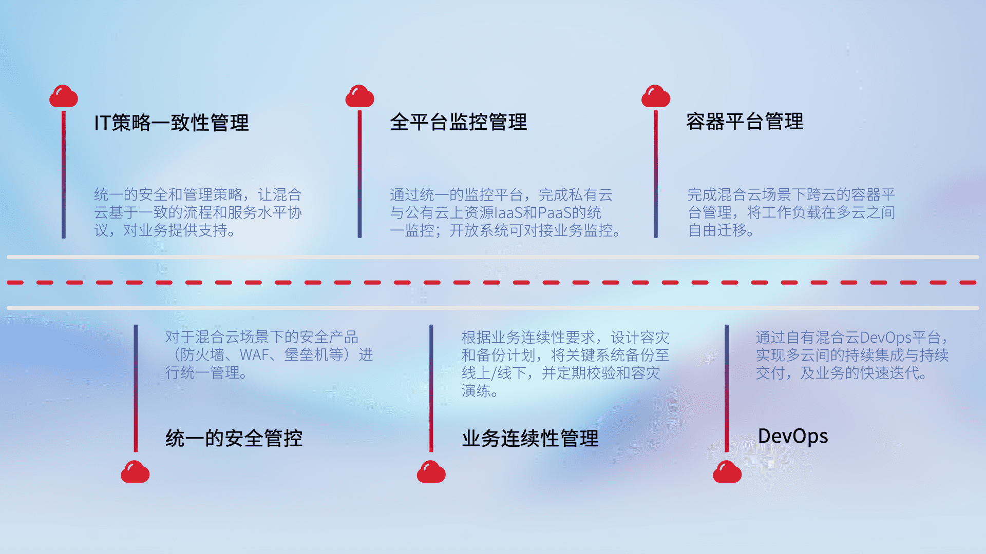 通过多云纳管,,,,以统一的资源数据模型把客户的云资源进行抽象和封装,,,,进而实现对多云资源的统一操作,,保障云资源管理的可靠性、、、、稳定性与可用性。。。。量身定制化运维内容,,配置、、、开发运维、、、补丁管理、、备份、、监控、、认证和访问管理、、、审计和日常巡检等,,保障在用云过程中的可靠度,,,稳定度以及高可用率。。。