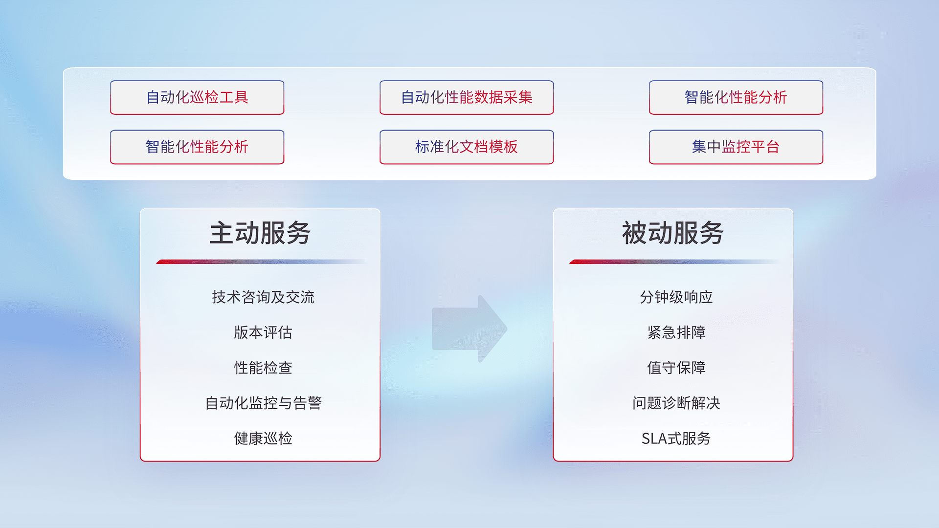 智能化工具和标准化文档,,,保障服务质量,,,提供主动服务(包含技术咨询、、、版本评估、、、、性能检查、、、、自动化监控与告警、、健康巡检)和被动服务包含(分钟级响应、、、紧急排障、、、值守保障、、、问题诊断解决、、、、SLA服务)。。